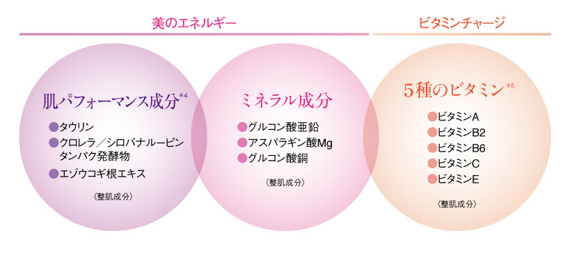 *1 植物性T3オイル(ホホバ種子油、スクワラン(オリーブ由来)、シア脂)、シソ種子油、アボカド油、オプンチアフィクスインジカ種子油、ワサビノキ種子油、サッカロミセス/ムラサキ根油発酵液、オリーブ果実油<保湿成分> *2 シャクヤク根エキス、ガノデルマアンボイネンセエキス、ハマナス花エキス、カミツレ花エキス、ビターオレンジ果実エキス、水、BG、ジパルミトイルグリセロホスホコリン、ジセチルジペプチド-9、コレステロール、パルミチン酸、ホルモイルグルタミン酸ジステアリルPEG-18、1,2-ヘキサンジオール、カプリリルグリコール、アルギニン<保湿・整肌成分>、ヒドロキシエチルセルロース<増粘剤>、フィチン酸<製品の安定剤>、フェノキシエタノール<防腐剤>
