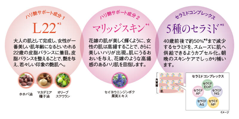 *1 ホホバ種子油、スクワラン(オリーブ由来)、シア脂油、シソ種子油、アルガニアスピノサ核油、クランベリー種子油、ヘーゼルナッツ油、ククイナッツ油、セラミドNG、ヒアルロン酸Na、ポリグルタミン酸、加水分解酵母エキス、オクラ果実エキス、コメヌカスフィンゴ糖脂質