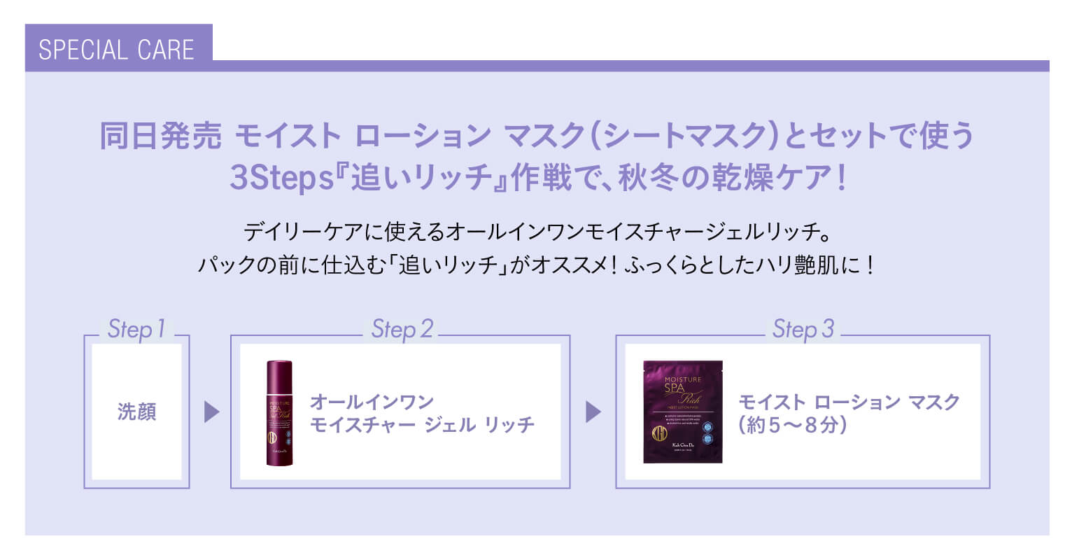 時間がなくても満足のいくお手入れをしたい女性に大人気の「ハリ・艶・保湿」に特化したオールインワンモイスチャージェルリッチの増量スペシャルセット。目指したのは「ブライダルエステ」で行うスーパー・トリートメントをご自宅で体験できるようなリッチな満足感で、1品6役(美容液・化粧水・乳液・クリーム・パック・アイクリーム)。初登場・非売品のモイストローションマスクは、乾燥したお肌に今すぐほしいうるおい成分(精製水を含む)を98%以上配合。時間が限られている時も、しっかりうるおいチャージ。
