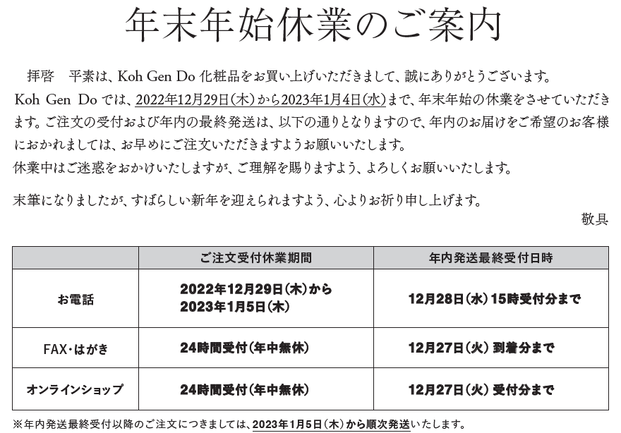 平素は、 Koh Gen Do 化粧品をご愛顧いただき、誠にありがとうございます。